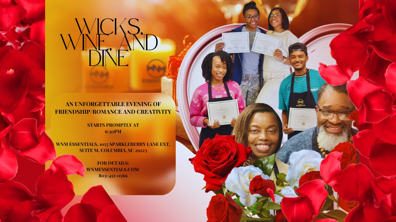 **This option is for Specific dates at 6:30pm. Note: Booking options are per person; however, this class is for couples. So please book in increments of two and be sure to select a meal plan for each participant. WICKS, WINE and DINE will be open for up to 8 couples, each participant will creatively craft one scent for an 13 oz candle and 1 oz Luxe Spray to gift their partner. Each couple will receive water, wine, and/or non alcoholic beverages with selected meal option. BYOB if preferred.